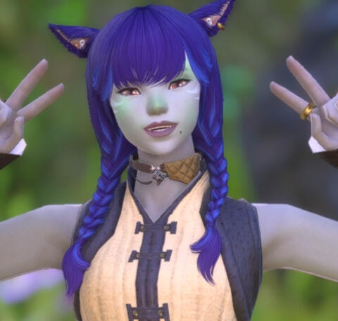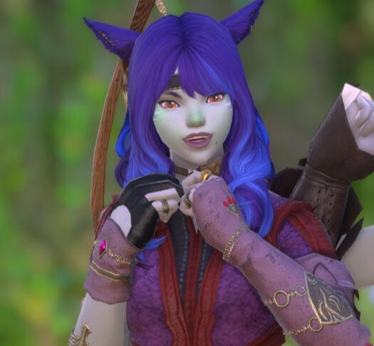 Sweet as honey and fierce as a coeurl, she is always her true and genuine self, including her rare moments of solemn introspection, which seem a little more frequent lately, as she is actively trying to find her place in the world, but she usually leaves the words of profound wisdom to her boyfriend, J'kotah. Her greatest loves are friendships, exploration, adventure, a good fight, a good meal, and the connections she makes with others.